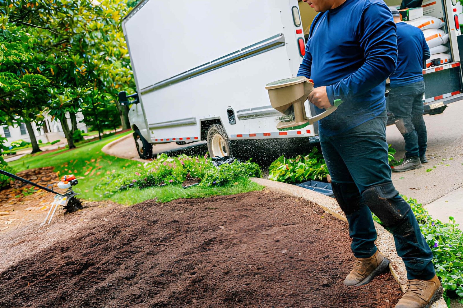 We deliver the mulch and prepare the beds.